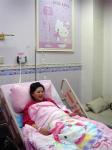 The hospital has 30 beds, with two beds in a room. Each room, with a Hello Kitty room number plate, is equipped with Hello Kitty bed sheets, pillow cases, blankets, dressers, pink curtains, wallpaper, and a large poster.
