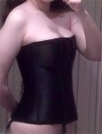 *giggles* @LostKitten, it was from La Vie en Rose, if you have some in your neck of the woods. Basic corset with hooks in the front and laces in the back. It's shiiiiny, although this crappy cell phone camera photo totally doesn't show that. I got the second-to-last black one at the location I was at but they had plenty of white ones.